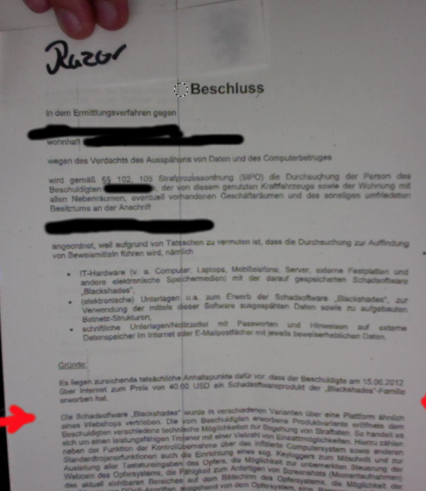 According to Mikko Hypponen this translates to: "It's a warrant for search and seizure, related to 'importing Blackshades XXXX' into Finland."