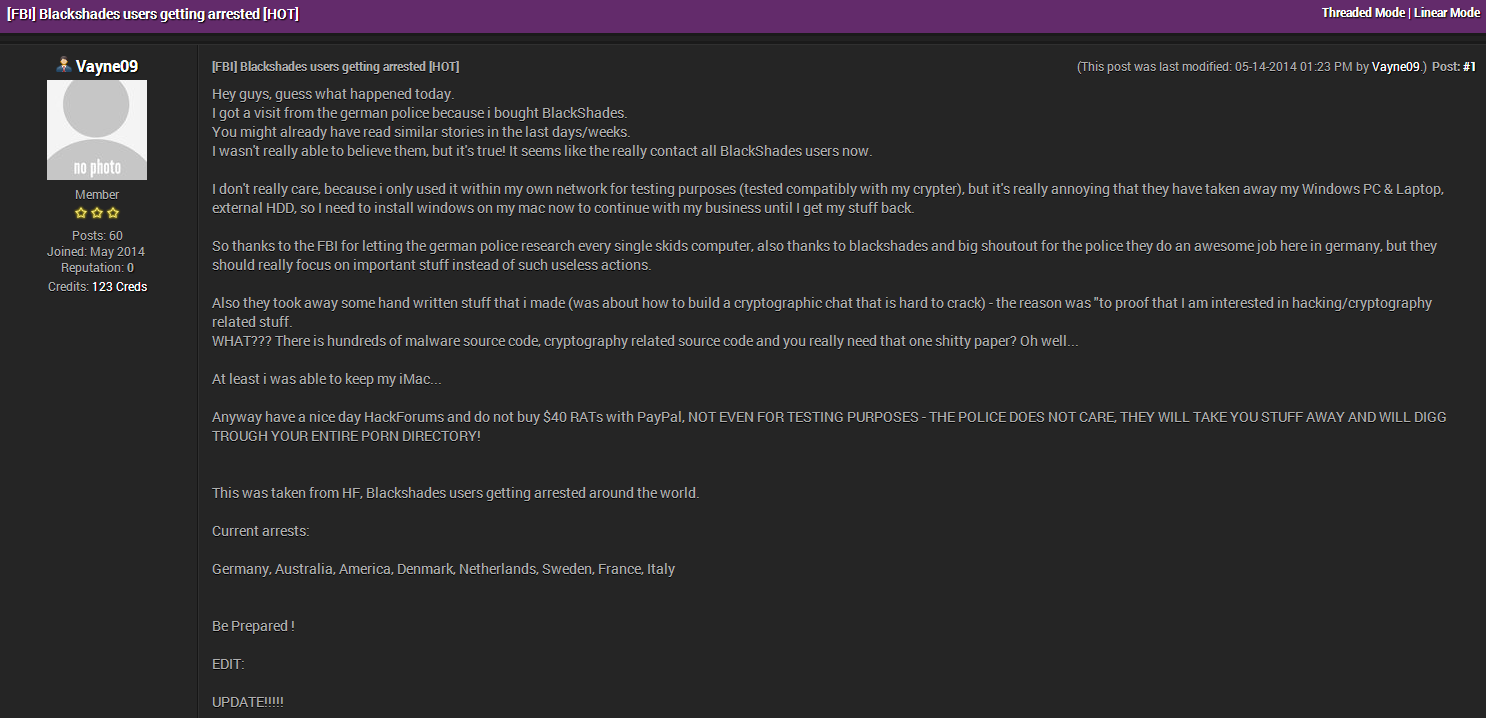 What connects all these arrests is that they are all connected to the BlackShades RAT. Most users complain they once bought the BlackShades RAT and that is why are being arrested right now.